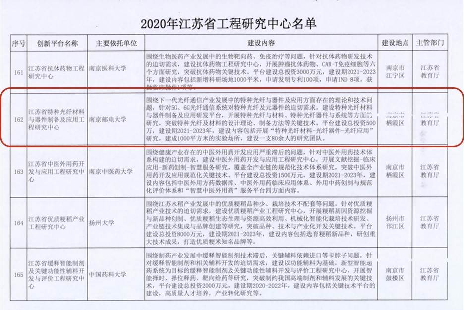 近日,从江苏省发展和改革委员会印发的《省发展改革委关于同意建设2020年江苏省工程研究中心的通知》(苏发改高技发〔2020〕1460号)中获悉,加勒比扑克申报的“江苏省特种光纤材料与器件制备及应用工程研究中心”获批立项建设。