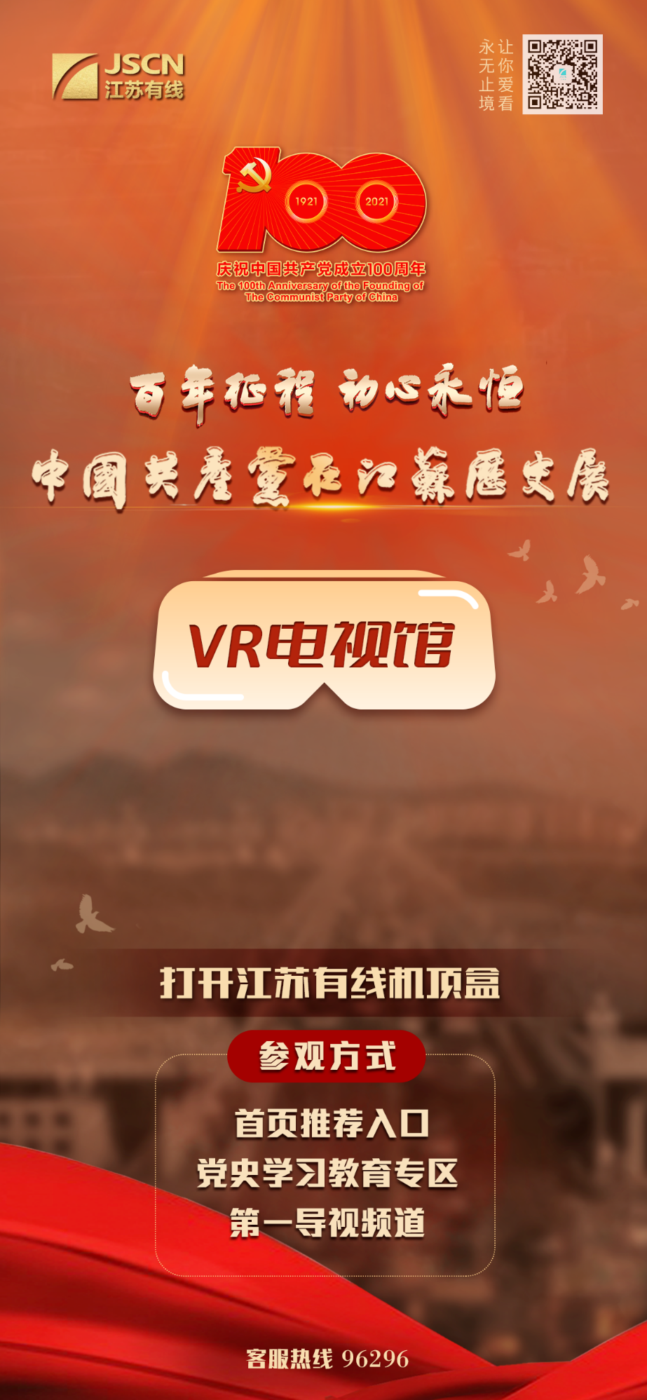 1、进入江苏有线电视机顶盒-加勒比扑克,点击“百年征程 初心永恒——中国共产党在江苏历史展”VR电视馆宣传海报,即可进入。