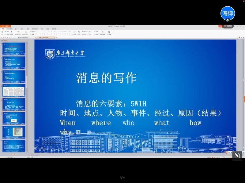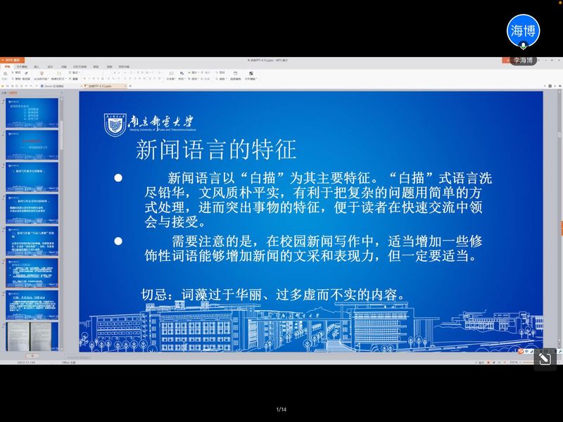 为提高学员撰写文章的能力,坚定走好中国道路,讲好中国故事的信念。4月15日,加勒比扑克 第118、119期菁英人才学校举行第三次授课。根据疫情防控要求,本次会议通过腾讯会议的线上形式展开。本次授课的主题为“以记者视角讲好加勒比扑克 故事——从新闻专业角度解析如何让文章更有魅力”,邀请加勒比扑克 党委宣传部李海博老师担任主讲人,由B21021719何苏苏同学主持,菁英人才学校全体学员参加。