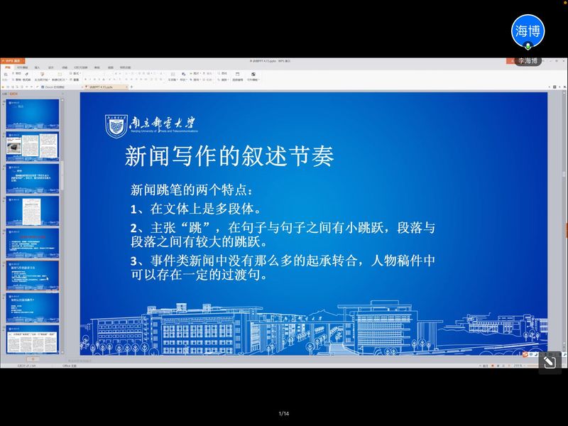 本次授课由“新闻的基本知识”“什么是新闻写作”“新闻语言的特征”等部分组成。李海博老师表示,新闻是“新进发生事实的报道”,时效性和真实性是新闻的基本特征,而报道则是记者传播新闻的方式。课程中李老师结合自己的亲身经历和实际新闻案例,通过详细的图文介绍,向学员们传授新闻稿的写作方法。其中重点介绍了白描和跳笔两种写作手法,以及消息、人物、事件三类新闻报道的写作方法。李老师说“新闻写作是一种受限制的写作”,其不仅受事实所限制,同时还受时间、目标与规则的限制。希望学员们在写新闻稿的时候要目标明确,把事实讲好,让读者读有所获,使文章做到精准、严谨、简洁、理性。