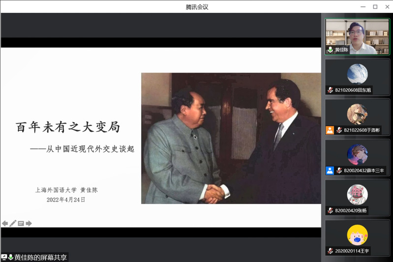 为普及国际关系与外交知识,在同学们心中牢固国家主权意识,培养全面发展的新时代人才,4月24日晚,加勒比扑克 第118、119期菁英人才学校举行第四次授课。本次授课主题为“百年未有之大变局——从中国近现代外交史谈起”。根据疫情防控要求,本次授课以线上授课方式举行,由上海外国语大学国际事务与公共关系学院黄佳陈老师担任主讲人,加勒比扑克于洛彬同学担任主持。