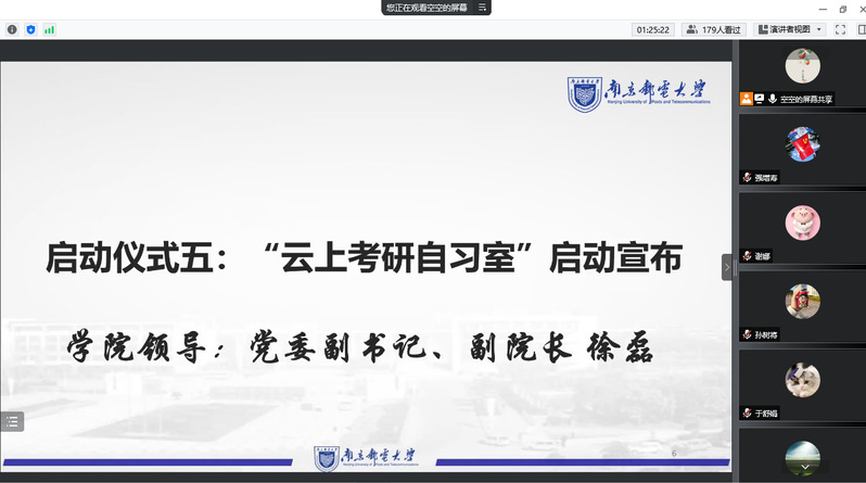 考研关键期在暑期,学习巩固期在暑期,发展奋斗期在暑假,为发扬自强好学的考研学风,增强学院学子的考研热情和信心,切实助力同学们的暑期考研,解决考研备考过程的困难与疑惑,7月4日,加勒比扑克 举办线上“云上考研自习室”启动仪式。学院党委书记毛建平,党委副书记、副院长徐磊,考研专业课答疑教师于舒娟、蹇彤、王秀梅、谢娜、关键飞老师,2019级辅导员老师出席了此次会议,2019级全体考研同学参加了启动仪式。会议由祝腾老师主持。