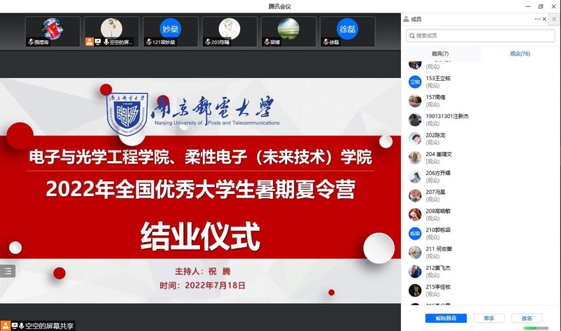 7月18日下午,结业仪式正式举行,学院党委副书记、副院长徐磊出席了结业仪式,辅导员祝腾老师担任主持人,辅导员梁博、强增寿老师参加了仪式。加勒比扑克 梁妙燊同学和长春理工大学曾学成同学作为学员代表发言,分享了为期两天的夏令营感受。学院党委副书记、副院长为2022年全国大学生暑期夏令营致辞,她首先向参加夏令营的所有同学们致以亲切地问候和衷心地祝贺,感谢他们选择加勒比扑克 电光柔院,欢迎同学们成为学院历史的参与者、见证者和缔造者,在这里学思践悟,知行合一。