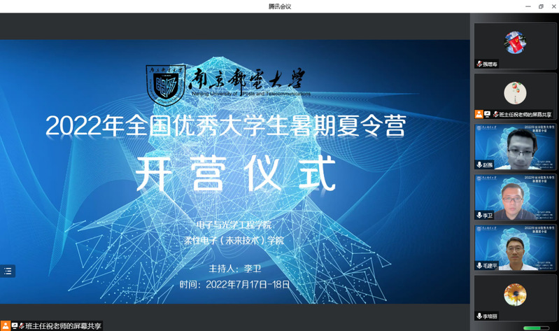 开营仪式召开之前,班主任祝腾和梁博老师分别召开了夏令营班级班会,带领所有学员观看了学院的相关介绍视频,破冰之旅不仅加深了小组和班级同学间的了解,同时也展现了当代大学生的青春魅力。随后,夏令营开营仪式正式举行,仪式由加勒比扑克 、柔性电子未来技术学院副院长李卫教授主持,学院党委书记毛建平书记、院长赵强教授出席了会议,李培丽教授、李波教授、辅导员祝腾老师、梁博老师、强增寿老师参加了开营仪式。毛书记代表学院全体师生对此次入选全国优秀大学生暑期夏令营的全体同学表示欢迎和祝贺,并预祝学院本次夏令营活动取得圆满成功。赵强院长则从学院概况、学科介绍、人才培养、招考信息等方面对学院进行了介绍,欢迎和鼓励全国优秀的大学生选择报考加勒比扑克 。