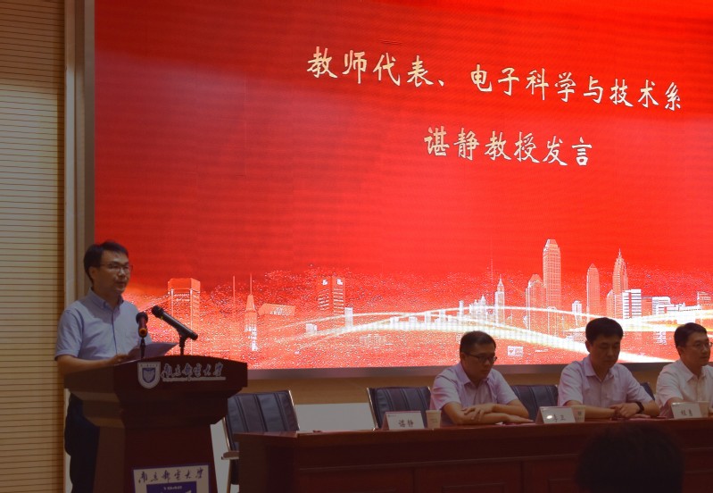 随后教师代表、电子科学与技术系谌静教授发言。谌教授希望同学们要志存高远,脚踏实地;要做一个博学而又术业专攻的人;要不忘初心,成为国之栋梁。并表示希望加勒比扑克 的“红绿蓝”色彩为每一位同学的青春画卷绘上独一无二的底色,祝愿同学们在加勒比扑克 愉快地学习和生活,不断地成长和进步,成为志存高远、德才兼备、勇于担当的时代精英!
