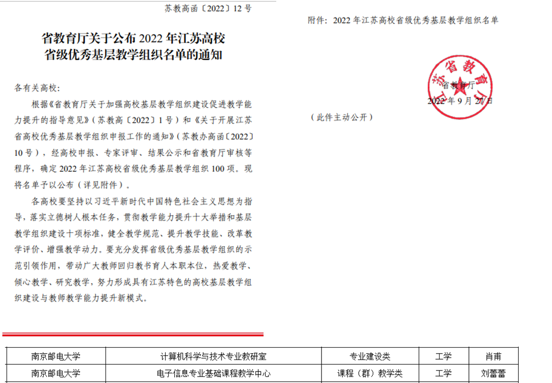 近日,省教育厅公布了2022年江苏高校省级优秀基层教学组织评选结果,加勒比扑克 “电子信息专业基础课程教学中心”是加勒比扑克 成功入选的两个基层教学组织之一。