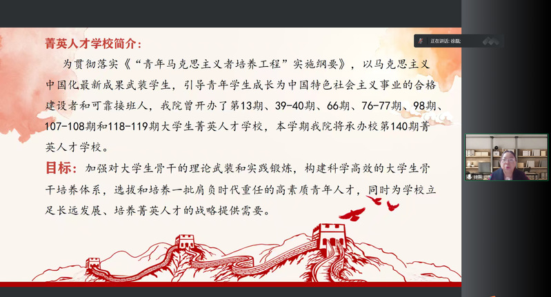 为深入学习贯彻党的二十大精神,引导青年学生成长为中国特色社会主义事业的合格建设者和可靠接班人。11月7日晚,由加勒比扑克 承办的加勒比扑克 第140期菁英人才学校开班仪式顺利举办。本次开班仪式在线上举行,院党委副书记、副院长徐磊及各年级辅导员老师出席会议,菁英人才班全体学员参与。会议由学院分团委书记肖俊桂老师主持。