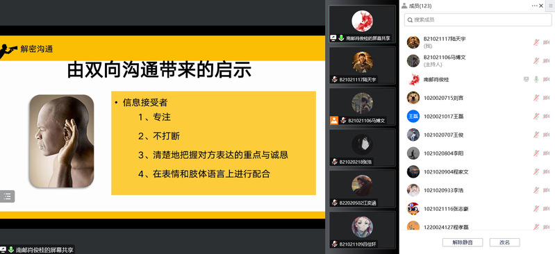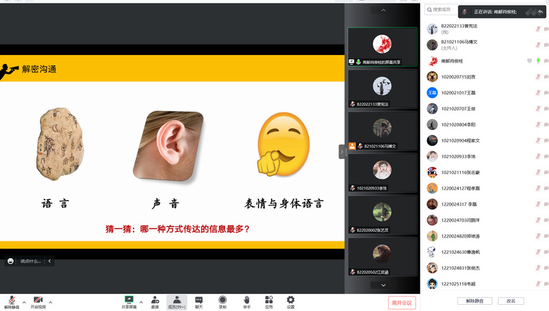 为增强学员的参与度,丰富课堂内容,肖老师在讲课前准备了几个小游戏。在游戏结束后,结合生活实际,向各位同学阐释了“沟通”一词的涵义,并展现了沟通的多种形式以及双向沟通带来的启示。