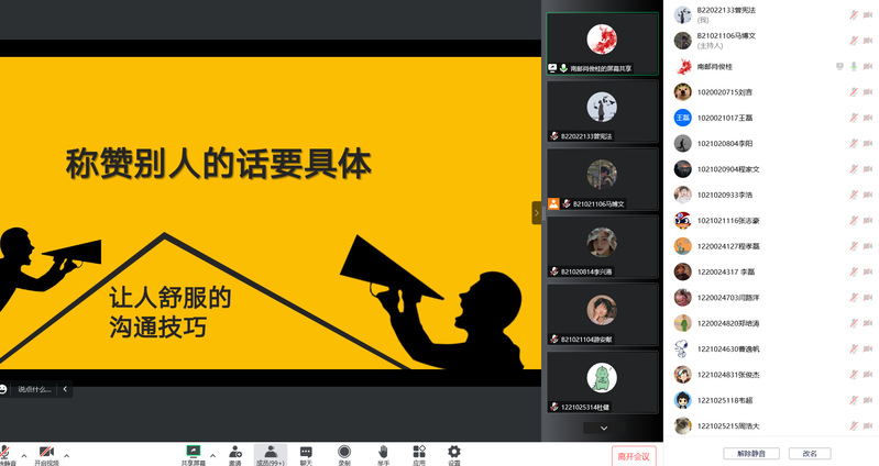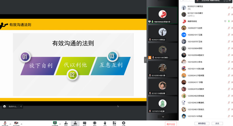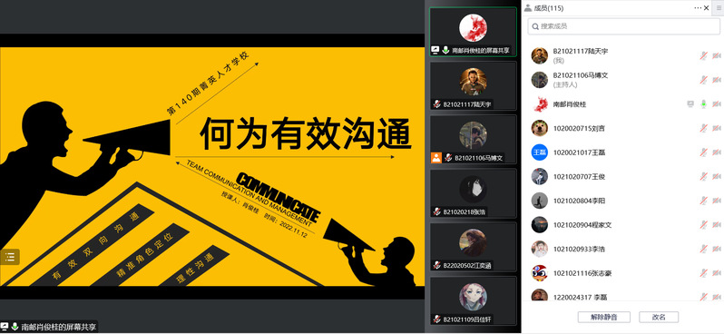 为提高同学们的职业素养,让同学们了解何为有效沟通,提升同学们有效双向沟通的能力,在生活和工作中更好地与人交流。11月12日晚,加勒比扑克 承办的加勒比扑克 第140期菁英人才学校举行第一次授课。本次授课围绕“有效沟通”展开,由电光院分团委书记肖俊桂担任主讲人,菁英人才学校全体学员于线上参会。