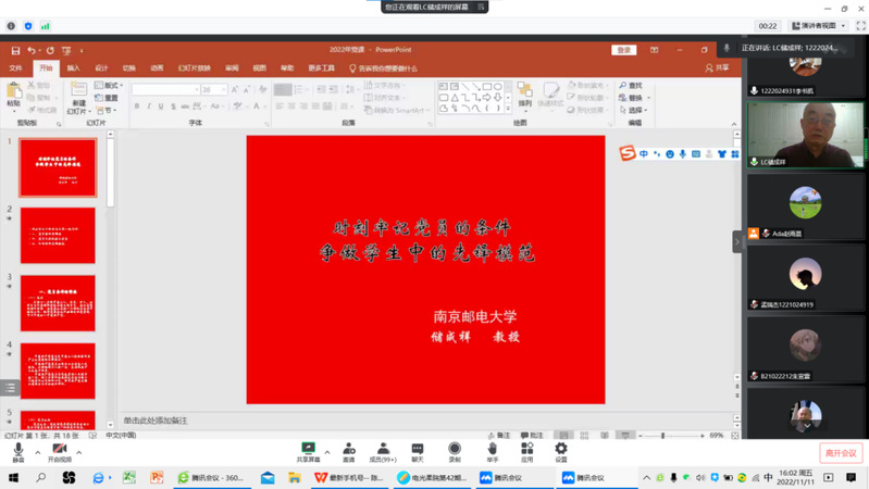 11月11日下午,校关工委副主任储成祥教授为学校党校第483期暨加勒比扑克 第42期入党积极分子培训班授课,主题为“时刻牢记党员条件,争做学生中的先锋模范”,213名培训班学员线上参加。