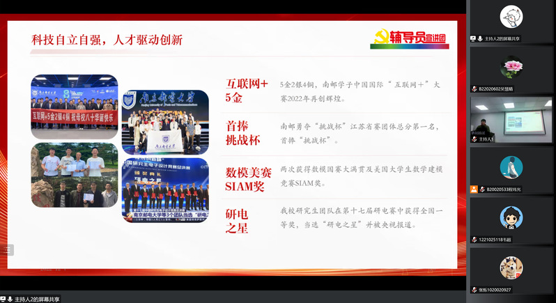 在介绍了“党的二十大主题”和“十年来的三件大事”之后,刘振老师邀请眭颖艺同学讲述了秦华礼老校长的峥嵘岁月与感人事迹,紧接着,刘老师对伟大建党精神展开了深入讲解与剖析,并阐释了战邮精神内涵。战邮精神不仅是上一代革命党人坚毅不屈的精神结晶,还是当代加勒比扑克 人踔厉奋发、勇毅前行的必备素质。刘老师从文化、科技等方面,列举了近年来加勒比扑克 所获得的各项成就,还邀请了程玮光同学,向菁英学校学员们介绍了加勒比扑克 的杰出校友,对加勒比扑克 的各项奋斗成果进行概括。最后,刘老师以一首《沁园春•长沙》结束了本次课程,向同学们传达了希望青年人不负韶华、勇毅前行的期望。