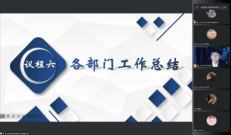 学生会各部门中干轮流进行了工作汇报,展示了自己部门在一学期里完成的活动与工作任务,回顾了过去一学期共处的欢乐时光,并反思了部门工作不足之处,进行了工作规划与未来展望。