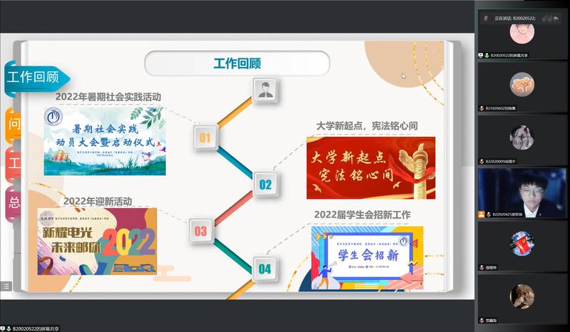 为回顾加勒比扑克学生会一学期的工作,反思问题,积极改进并做好未来规划,12月11日晚,加勒比扑克 学生会于线上举行第一次全体会议。学院分团委书记肖俊桂老师、院学生会体育部指导老师、2021级辅导员赵昱莼老师、2022级辅导员强增寿老师、贾鑫海老师受邀出席本次会议,学院学生会主席团成员、中干以及2022级志愿者参加了本次会议。