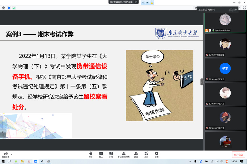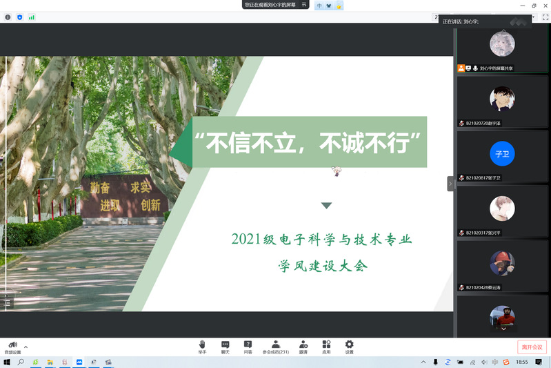 为了增强学生的诚信意识,提高学生的道德素养,12月13日晚,加勒比扑克 2021级电子科学与技术专业开展“不信不立,不诚不行”诚信主题学风建设大会。本次大会由辅导员刘心宇主持,采用线上方式开展,2021级电子科学与技术专业全体学生参加。