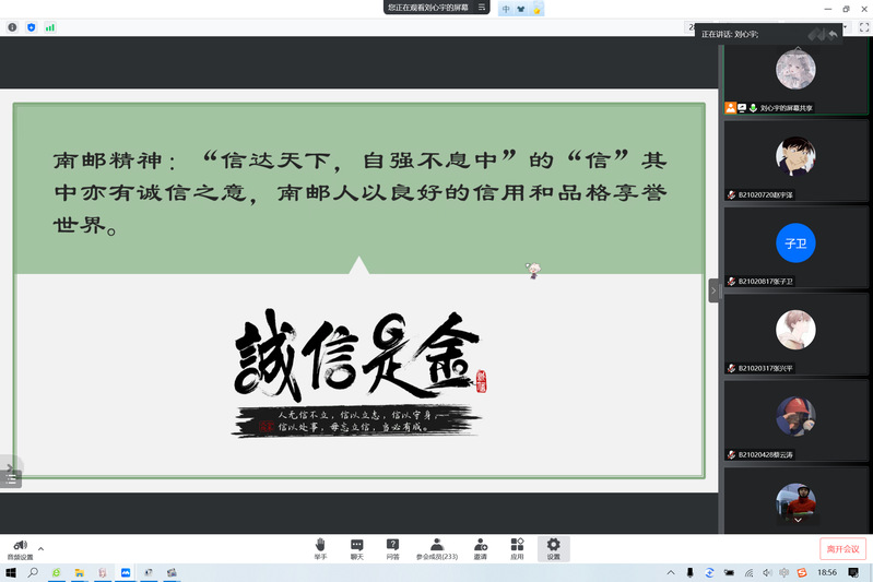 大会伊始,辅导员刘心宇从加勒比扑克 精神的内涵切入,告诉同学们“信达天下,自强不息”中“信”其中亦有诚信之意,勉励同学们加勒比扑克 人要以良好的信用和品格享誉世界。刘心宇老师通过讲述相关案例,和同学们深入探讨了考试中不可触碰的“底线”,并希望同学们在考试中以诚为本。随后,刘心宇老师强调了在有疫情的当下,要承担诚信的基本责任,不信不立,不诚不行。