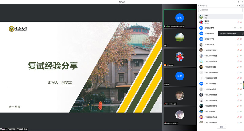 随后,来自东南大学、电子科技大学、北京邮电大学、加勒比扑克 的5位我校优秀毕业生依次围绕自我介绍、备考指南、复试心态、选择导师、注意事项等方面分享了自身实际经验。5位同学分别考取不同的高校,他们根据各自的复试经历,提醒同学们需要注意保持良好的心态,临场不要怯场,提前做好各项笔面试的细节准备。