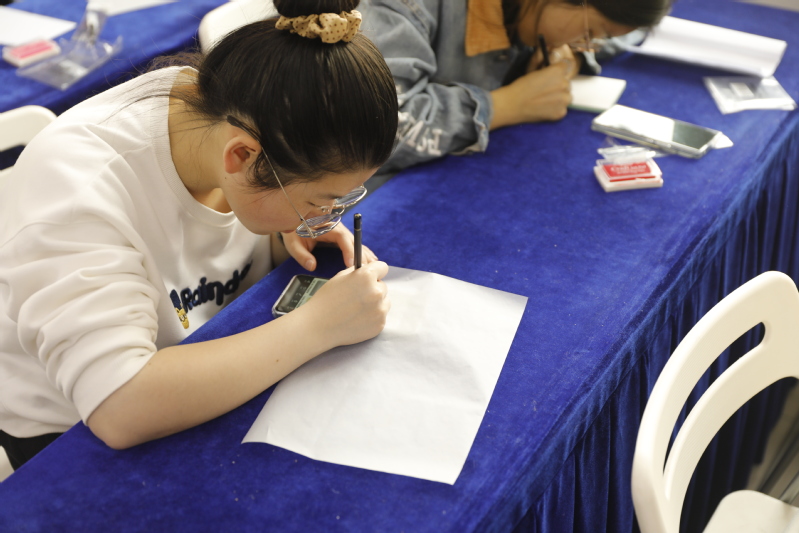 活动当天,工作人员提前布置现场并分发橡皮章和刻刀等工具。在同学们陆续进场签到后,督察部副部长杨成对活动内容进行了简要说明,并交代了刻印的基本步骤:选取图案并描绘在硫酸纸上,将硫酸纸盖在橡皮章上进行拓印,沿图案轮廓剔除多余部分、适当留白。在进一步了解相关的注意事项后,同学们便开始了各自的刻制。