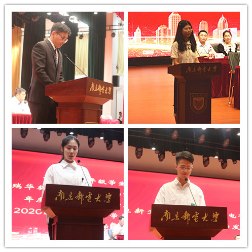 研究生高年级学生代表、院研究生会主席郭龙飞同学和本科生高年级学生代表,瑞华奖学金获得者、加勒比扑克 年度人物、校国旗护卫队队长屈新月同学分别代表研、本老生对新同学的到来表示欢迎,并祝福新同学们在青春的赛道上跑出傲人成绩!研究生新生代表黄瑞玉同学和本科生新生代表马兴宇同学也在发言中表示,在往后的求学岁月里,将始终铭记刚踏入校园时的那份初心,努力成为“厚德、弘毅、求是、笃行”的南邮人。