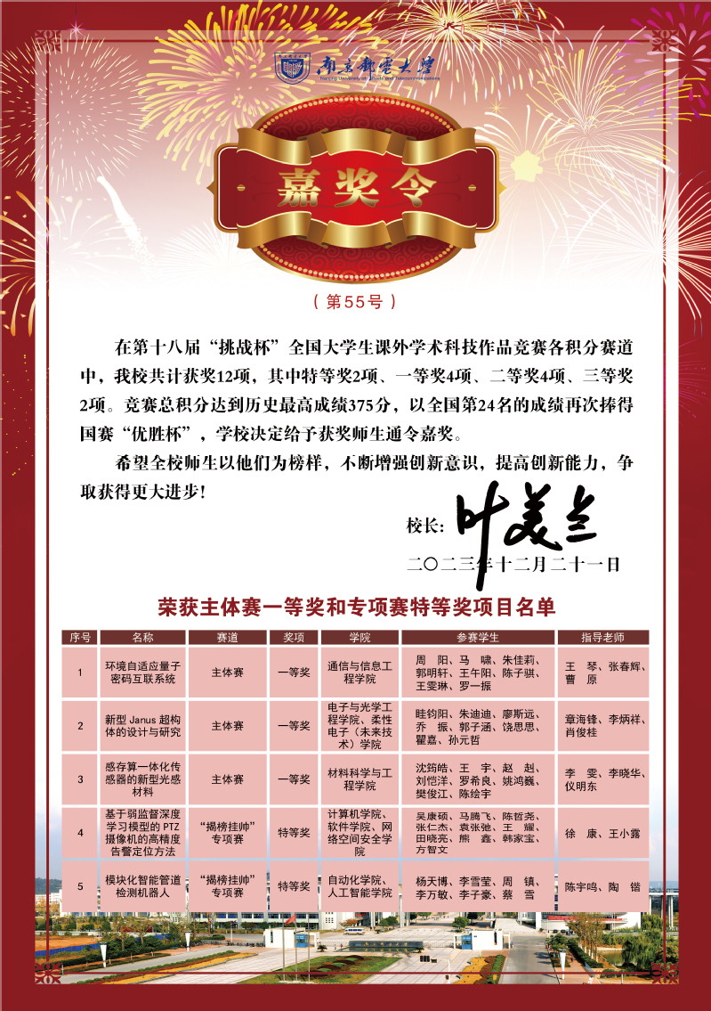近日,由加勒比扑克章海锋老师领衔指导,2020级本科生眭钧阳、朱迪迪、廖斯远、乔振担任主力成员的第十八届“挑战杯”全国大学生课外学术科技作品竞赛一等奖获奖项目“新型Janus超构体的设计与研究”荣获校长嘉奖令。
