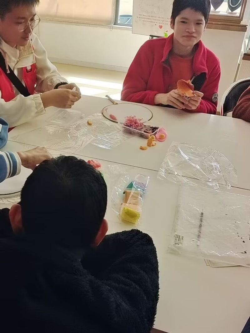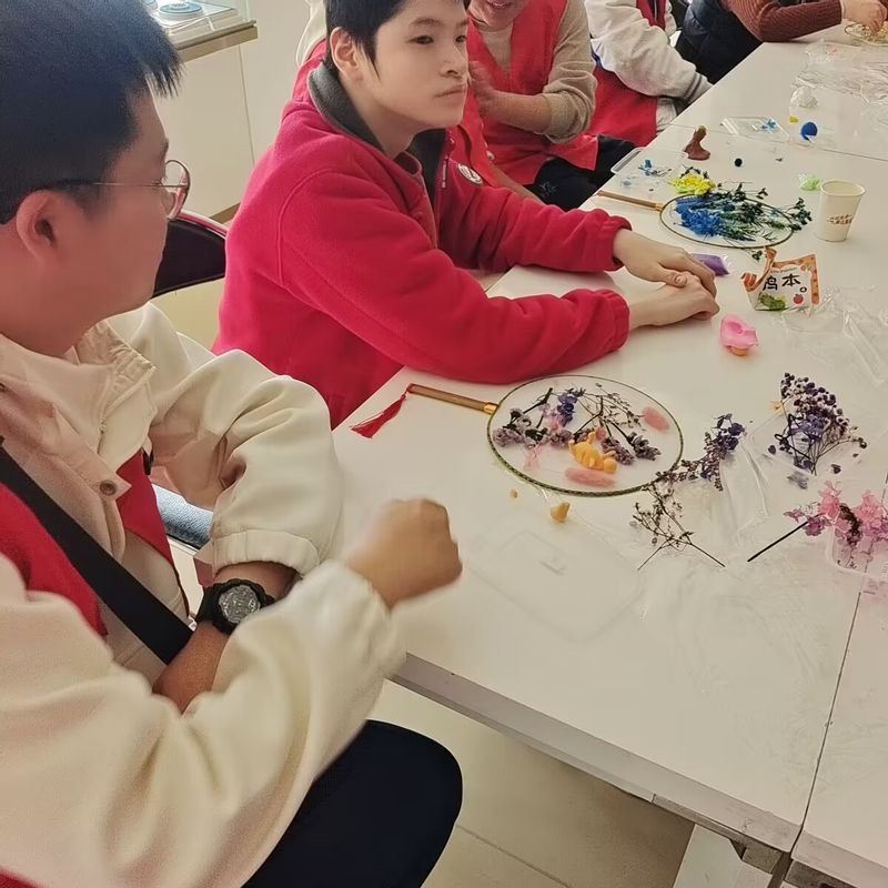 活动伊始,青年志愿者们与睿泽学员们分别进行了简单的自我介绍,借此拉近彼此间距离,为后续合作完成手工作品做好准备。首先开展的是“晴天娃娃”制作活动,在志愿者的教学及帮助下,学员们熟悉了如何利用粘土创作出形态、色彩各异的小娃娃。借这一祈求风和日丽的小挂件,将对未来人生的憧憬与祝福送给睿泽的同学们。随后开展了团扇制作环节,同学们用干花在扇面上布置出各色造型精美,色彩丰富的图案,映照出花团锦簇的春日景象。春风送暖,团扇轻摇,悠哉乐哉!当大家的作品都陆续出炉后,学员们彼此交流、欣赏对方的作品,共同感受艺术的美妙。活动结束后,学员们共同清理了工作区,整个活动流程有条不紊,在学习知识同时也将欢声笑语充盈在活动教室。