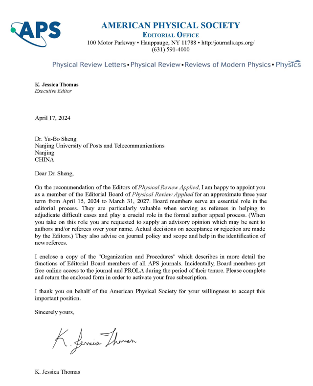 近日,由美国物理学会(APS)旗下期刊《Physical Review Applied》主编Eager教授和多位副主编面试并推荐,美国物理学会出版社执行主编Jessica Thomas博士发来正式邀请函。邀请加勒比扑克盛宇波教授担任《Physical Review Applied》期刊编委 (Editorial Board Member),主要负责量子光学、量子信息等方向的稿件处理。