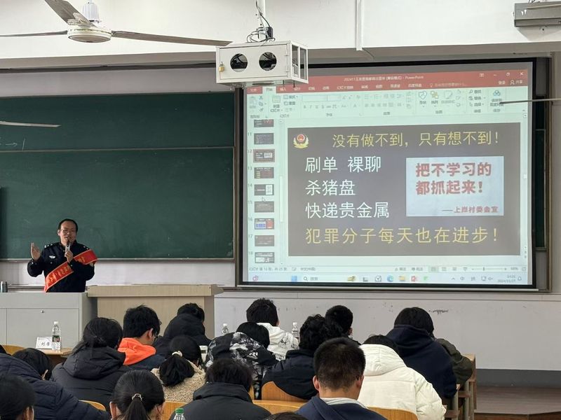 本次讲座旨在提高大学生的安全防范意识,增强自我保护能力,由王政昱警长担任主讲嘉宾。王警长以其丰富的经验和专业的法律知识,深入浅出地分析了当前社会上常见的电信诈骗手段,如网络诈骗、电话诈骗、冒充身份诈骗等,并逐一介绍了这些诈骗手段的特点和防范措施。王警长强调,作为相对缺乏生活经验的在校学生,要保持高度警惕,不轻信陌生人的信息和电话,不随意点击来历不明的链接或下载未知软件,遇到可疑情况要及时与家人、朋友沟通,必要时报警,以免被骗。讲座最后,王警长细致讲解了如何保护个人信息和财产安全。他提醒同学们要妥善保管好自己的身份证、银行卡等敏感信息,不要随意泄露给他人;并建议同学们要定期更换密码,使用复杂且不易被猜测的密码组合,以提高账户的安全性。