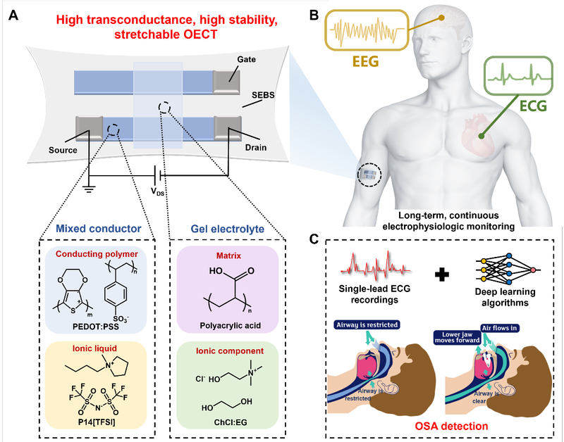 图 1. 用于长期电生理监测和OSA检测的高性能、可拉伸和高稳定性OECT