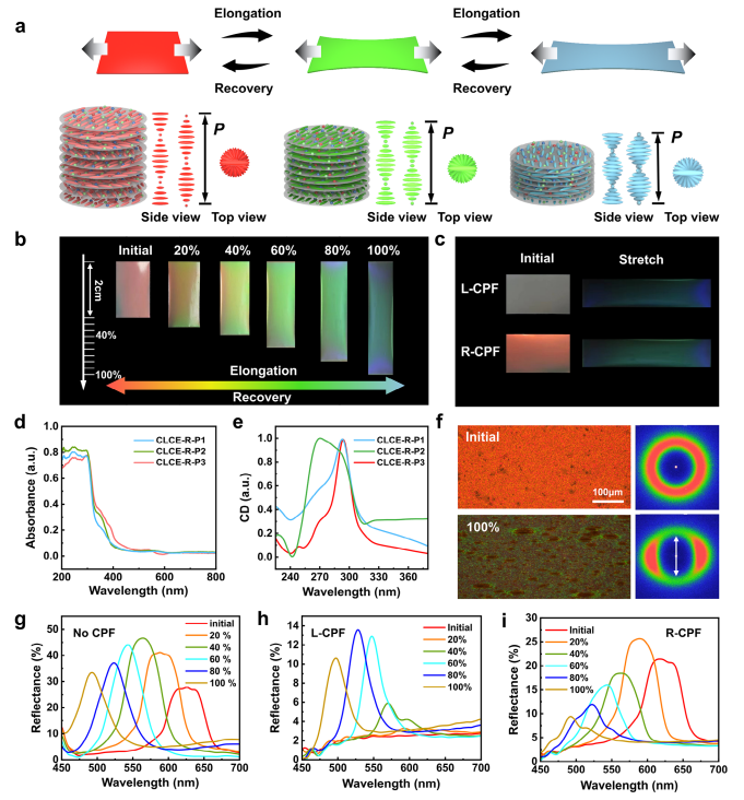 图1. CSE-RTP薄膜的机械变色与手性光学性质。(a)通过拉伸和释放CSE-RTP薄膜反射不同颜色的示意图。(b) CSE-R-P3薄膜在不同应变下的照片。(c)CSE-R-P3薄膜在初始和拉伸状态下,分别通过L-CPF和R-CPF观察的照片。(d)CSE-R-P3薄膜的吸光度和圆二色性光谱。(f)POM图像和WAXD。(g-i) CSE-R-P3薄膜在无CPF、L-CPF和R-CPF条件下和不同应力下的反射光谱。