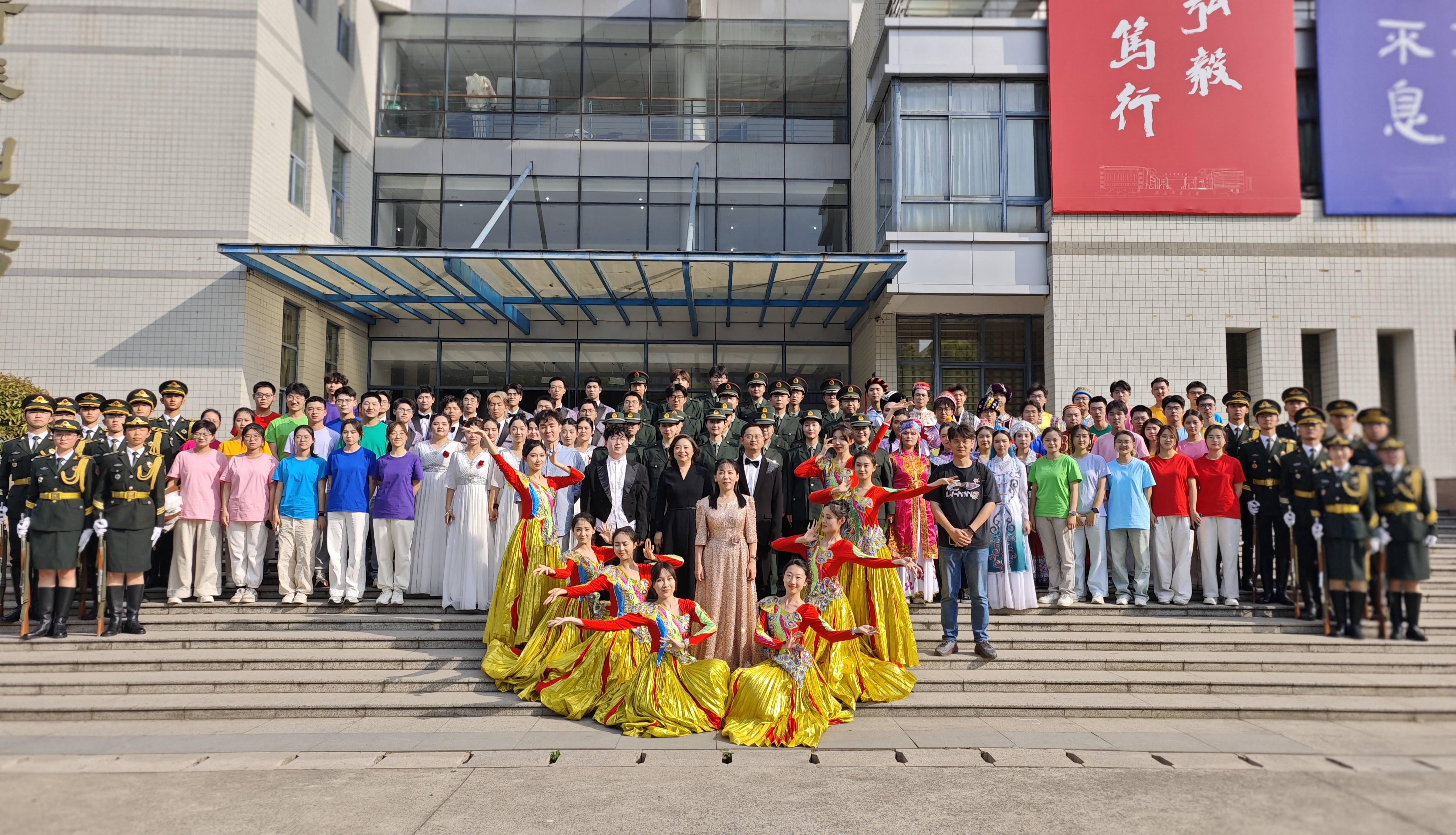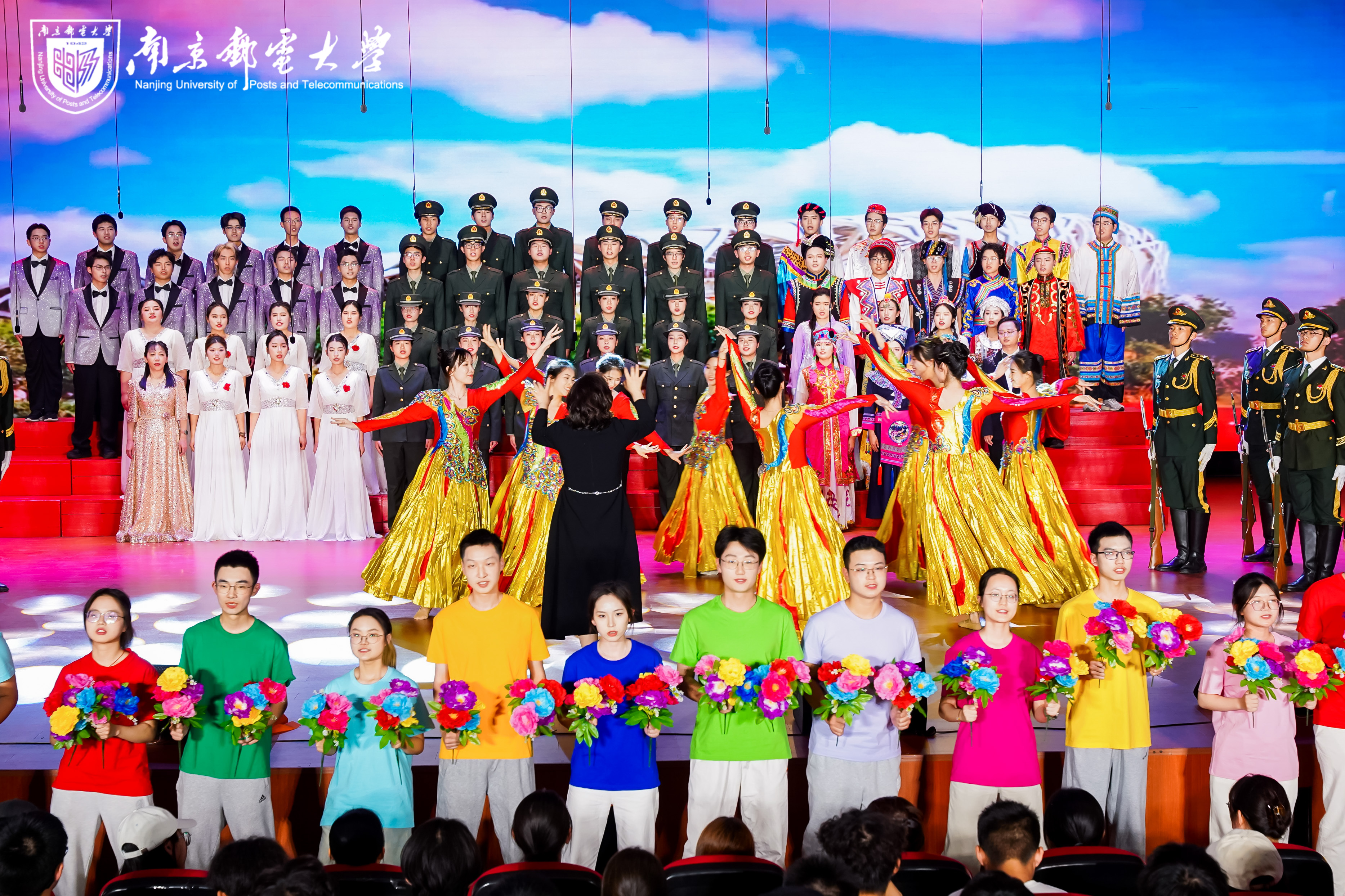 文化育人厚植家国情怀。当“走向复兴!走向复兴!走向复兴!创造辉煌!”的叠唱如浪潮般层层推高,穹顶灯光骤然倾泻而下。八名学生身着鎏金舞裙翩然登场,她们双臂舒展如展开的羽翼,旋转间,裙裾上暗藏的56颗水晶随灯光变幻,恰似星河落入人间;身着彩衣的青年学子手执鲜花,奔跑着向舞台中央汇聚,朝气蓬勃的面庞和绚烂怒放的鲜花相互辉映,青春之中国、盛世之中国在此刻具象化。