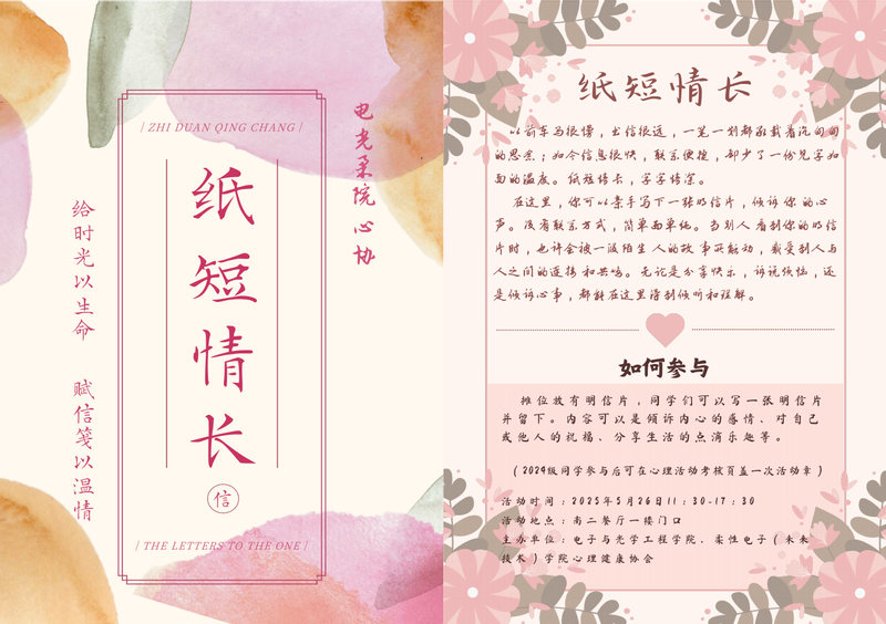 活动最终征集到400余张明信片,远超预期参与热度,折射出同学们对情感表达的强烈渴望。一张张卡片是独一无二的心灵切片,或是迷茫时的自我鼓励,或是对挚友的期许祝福,亦或是对生活细碎美好的捕捉。这些带着温度的文字,共同构成了专属于电光柔院心协的“情感备忘录”。本次活动作为学院“5·25心理健康日”系列活动,以“轻量”“柔性”“互动”的形式引导同学们关注内心世界。通过书写与传递,参与者不仅获得了情感释放的窗口,更在他人的文字中寻得共鸣与力量。明信片不仅是一张纸片,更是时光的信差,它会替我们保存此刻的心跳与期许。