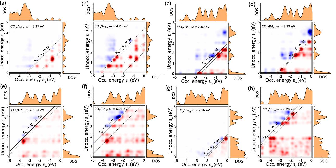 在机理解析层面,该研究成功构建了基于矩约束神经网络的rt-TDDFT替代模型,在保持与第一性原理计算相当精度的前提下,将等离子体动力学模拟速度提升三个数量级。模型通过引入MPT守恒矩作为软约束,有效抑制了长时递归中的能量漂移与相位偏差,确保了电荷守恒与偶极一致性,在时域与频域均展现出良好的物理保真度。对CO2/M13体系的系统评估揭示了金属电子结构对能量耗散路径的决定性影响:Ag团簇呈现弱阻尼长寿命振荡(γ≈3.3毫电子伏),Pd团簇因d带屏蔽导致快速耗散(γ≈23.7毫电子伏),Rh与Ru则分别表现为模式拍频与双通道干涉特征。研究团队进一步引入了基于实时 TDDFT 的跃迁贡献图分析。通过对比 Ag、Pd、Rh、Ru 等不同金属核体系的 TCM 分布,可以揭示了峰位、线宽和阻尼差异背后的“微观跃迁通道”,不仅加深了对 CO₂/金属簇超快载流子动力学本质的理解,也为后续在矩约束神经网络中引入更具物理含义的特征设计和约束项提供了重要依据。