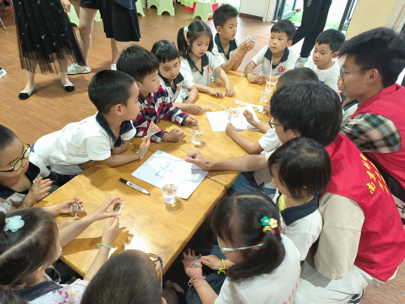 大学生志愿者们在孩子们的包围中,分成三个区域,开始了科普活动。在神奇水杯区域,孩子们观察到自己绘制出的图案在装满水的玻璃杯中忽大忽小,忽左忽右,感觉是在变“魔术”。随后,志愿者又拿出一根吸管,展示在水中吸管的“曲折”,并用小猫钓鱼的故事讲述了光传播的奥秘。
