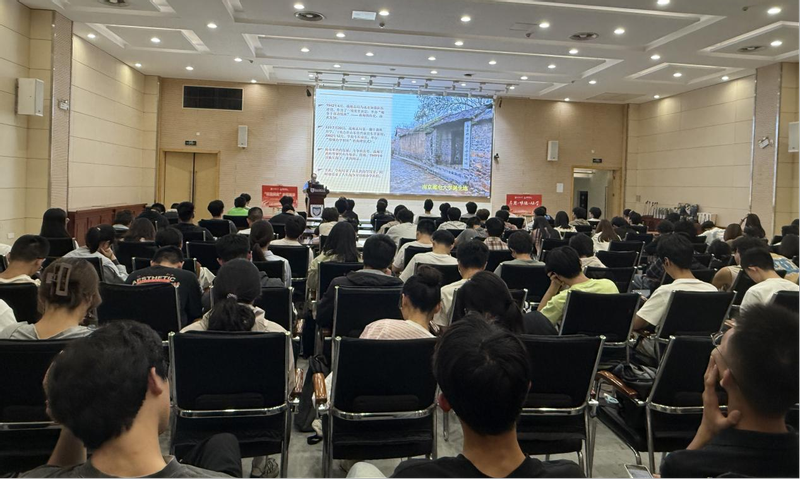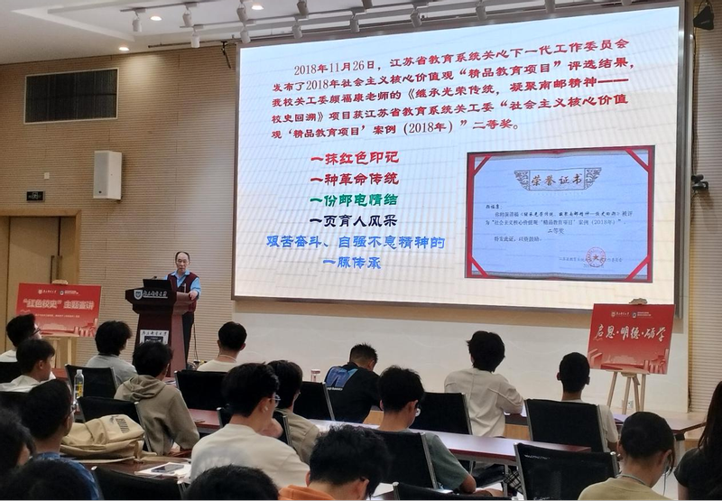 学校关工委颜福康老师以《赓续红色血脉:南邮校史中的精神丰碑》为题,用生动详实的校史故事,带领师生重温了学校80余年办学历程中的红色记忆。他深情讲述了1942年战邮干训班时期“人在文件在”的感人故事,通过一个个鲜活的历史人物和事件,将南邮人艰苦奋斗、忠诚报国的精神娓娓道来,让在场师生仿佛穿越时空,亲身感受到那段激情燃烧的岁月。颜老师饱含深情的讲述,不仅再现了南邮发展的历史画卷,更深刻诠释了“信达天下,自强不息”的南邮精神内涵。