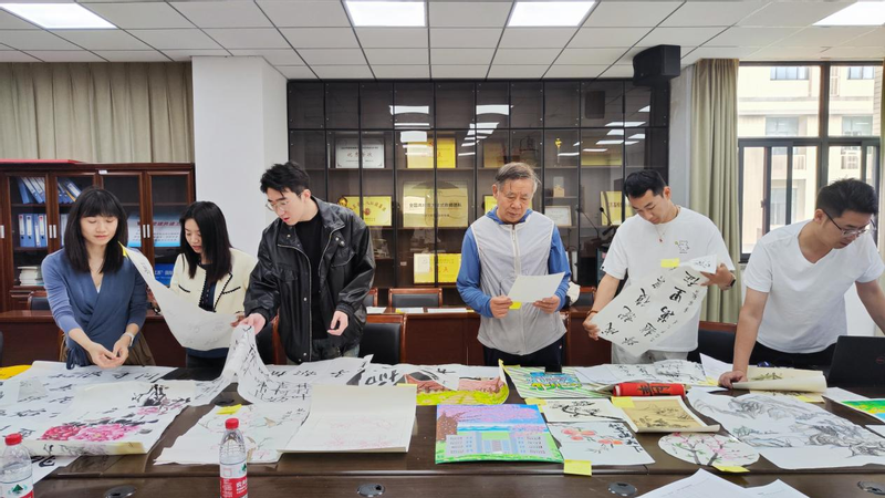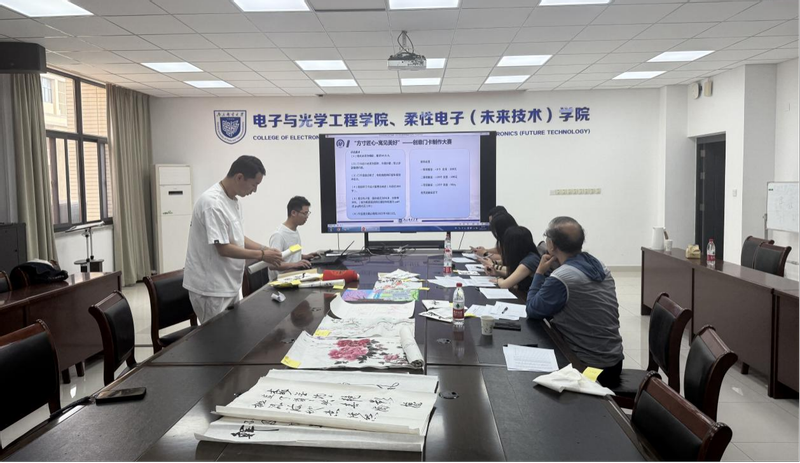 本届文化节设置创意门卡设计、书画艺术作品、无烟宿舍主题海报三大竞赛单元,共收到涵盖创意门卡设计、书画艺术创作、无烟宿舍主题海报等类别的百余件作品。各参赛宿舍充分发挥想象力,结合专业特色和校园文化,提交了众多高质量作品。参赛作品充分融合光学元素、柔性电子技术特征与南邮文化基因,展现了学生跨学科创新思维。成谢峰老师在评审时特别指出:“作品将5G基站、量子通信等专业元素与传统书画技艺创新融合,这种古今对话的创作方式,既彰显了工科生的艺术修养,也体现了文化传承的时代价值。”作为具有多年教龄的老教授,成老师还现场提议可以将柔性显示技术应用于书画装裱,实现艺术与科技的有机统一。