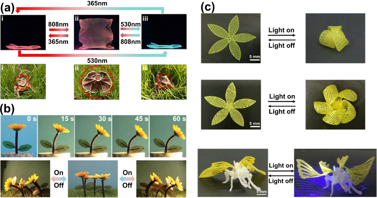 该综述回顾了刺激响应型LCEs的最新进展,包括热响应型、光响应型、电响应型以及其它响应类型(如化学响应、磁响应、湿度响应、射频响应、超声响应和光热响应型),这些研究成果都为其的发展做出了重要贡献(如图1)。LCEs能够在光照下能产生形变,模拟自然界中的蜥蜴和向日葵,可用作光响应仿生装置(图2)。LCEs表现出跨越多个数量级的卓越性能,通常可实现5%–500%的驱动应变、0.01–20 MPa的应力以及快速响应速度,使其成为执行器和人工肌肉领域极具前景的材料。此外,文章还总结了这些响应型LCEs在信息加密、力传感器和物质运输等方面的应用,能够有力地推动下一代先进功能材料。最后总结了当前高性能LCEs面临的挑战,并对其所蕴含的新兴研究机遇进行了展望。